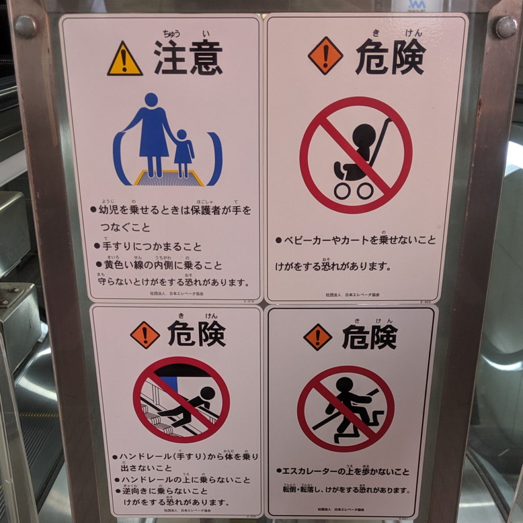 上の2枚は正しい乗り方、カート類禁止を示すステッカーで、公式のラインナップには載っていないデザイン。開業からだいたい20年以上が経過した建物のエスカレーターでよく見かけます。