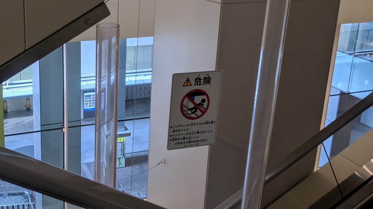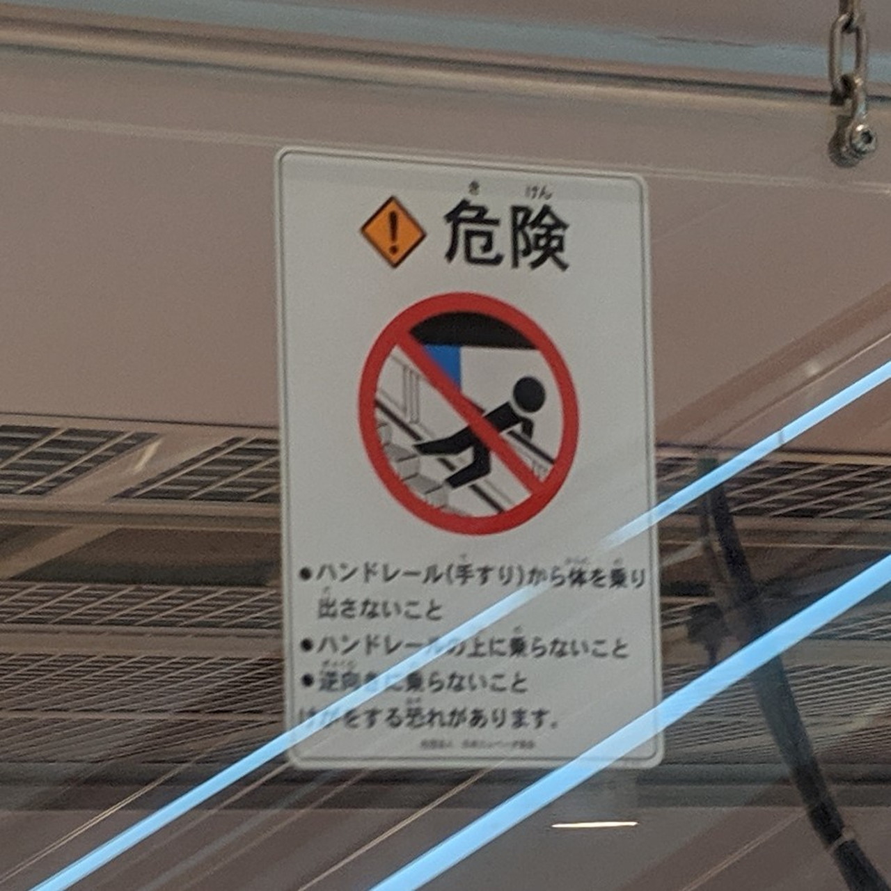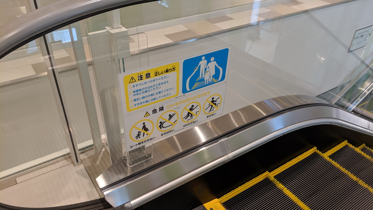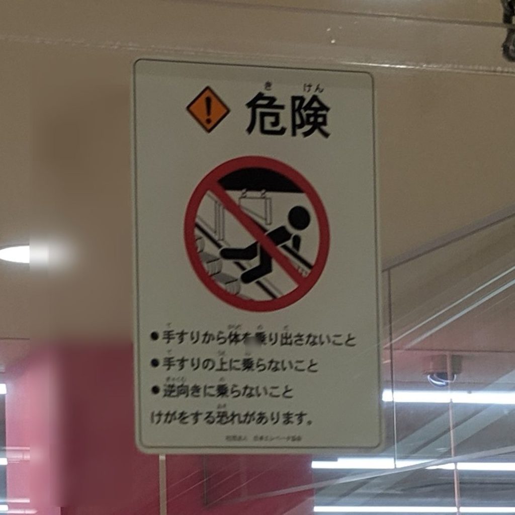 保護板には四角型乗り出し禁止が1枚。新しい施設に設置されたエスカレーターでは先ほどの2種類のセットのみというところが多い印象ですが、YUFURAのように四角型を確認できる場所もあります。