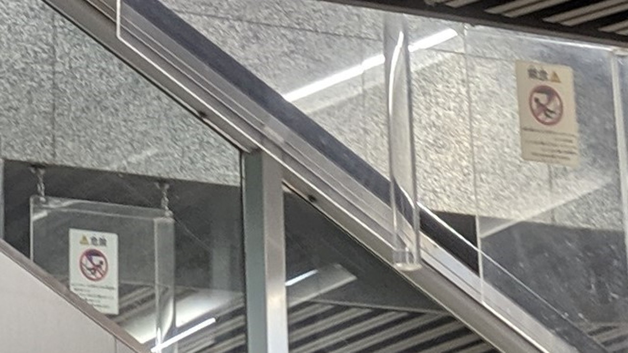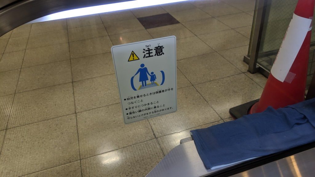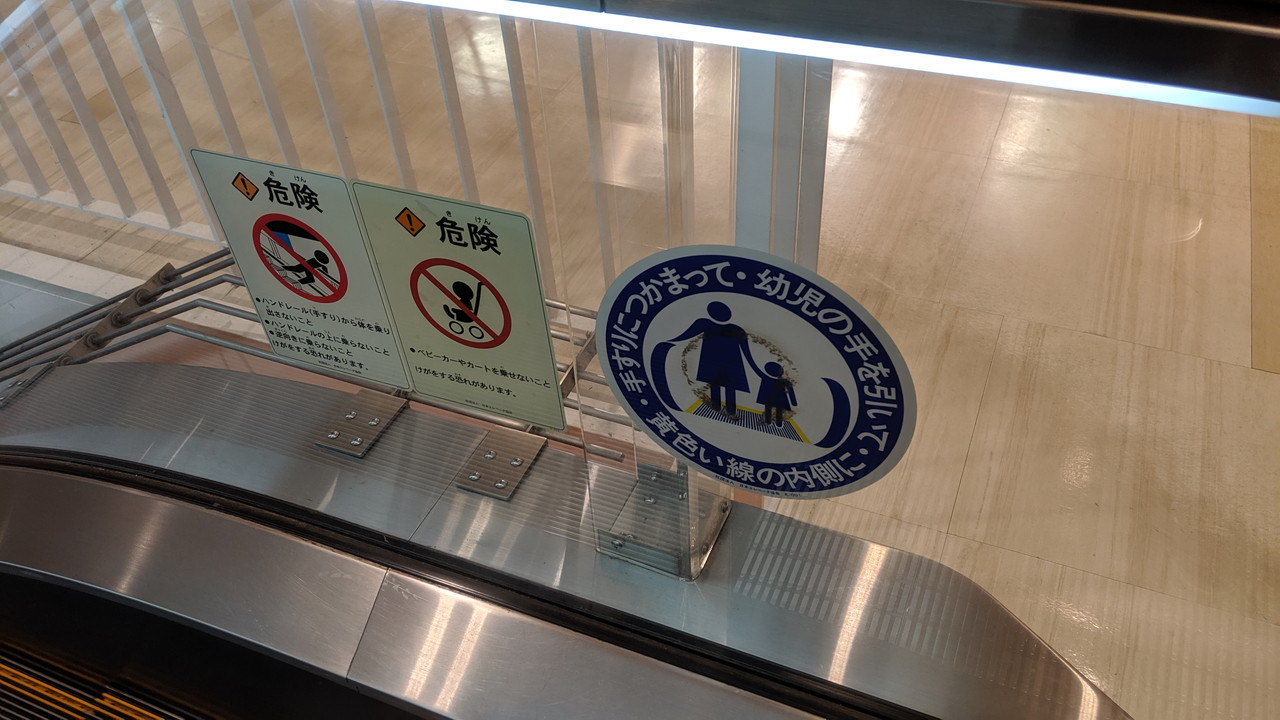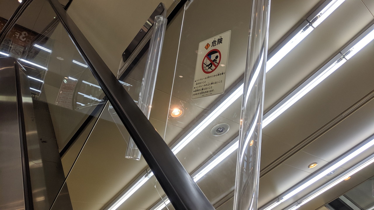 保護板には四角型乗り出し禁止が1枚。新しい施設に設置されたエスカレーターでは先ほどの2種類のセットのみというところが多い印象ですが、YUFURAのように四角型を確認できる場所もあります。