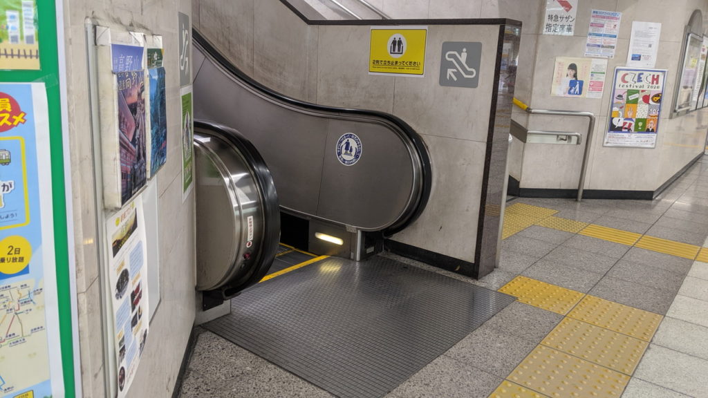 改札口の真上にある大きな南蛮屏風が目を引く駅ビルですが、エスカレーターのステッカーは丸型の1種類だけ。駅ビルの大きさの割にシンプルです。