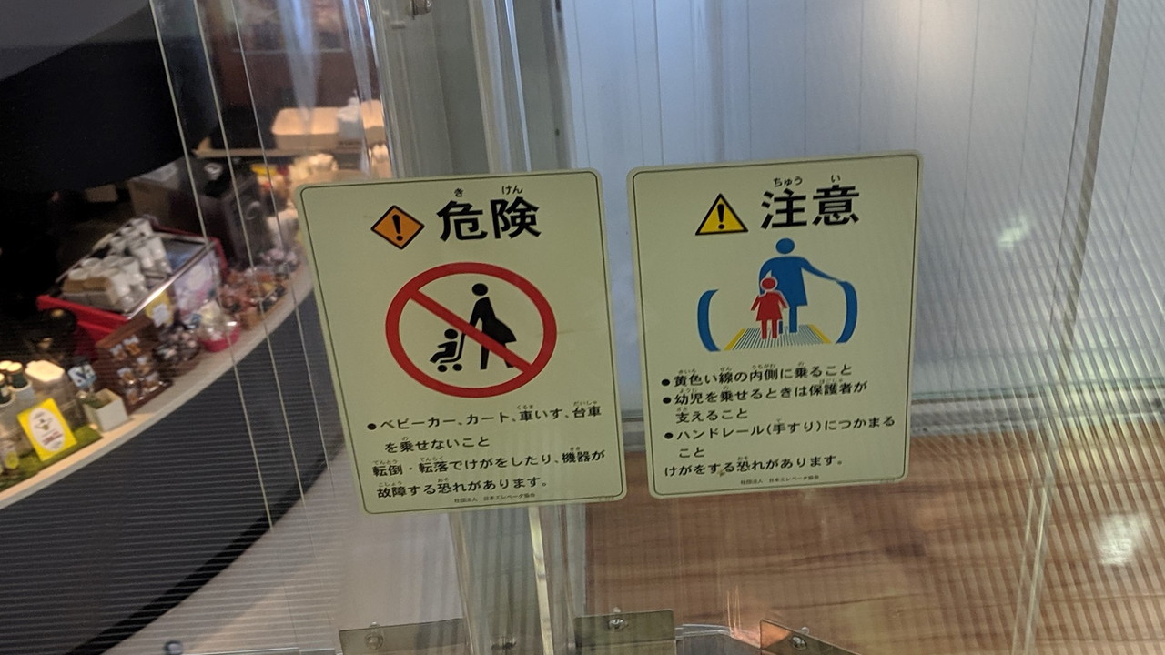 フロアによって、保護板に貼られた乗り出し禁止のステッカーのデザインが異なっていました。