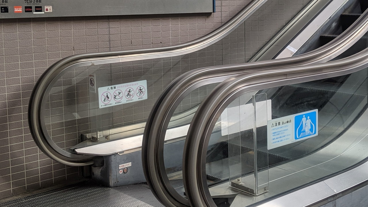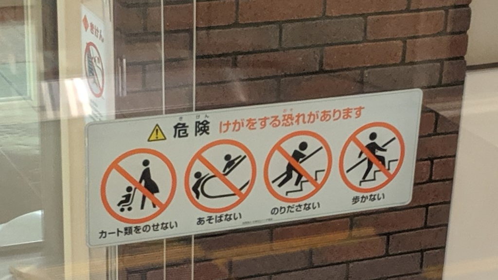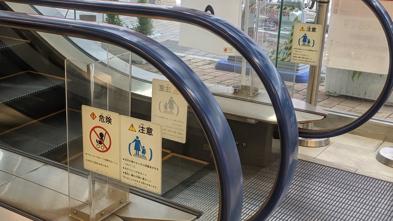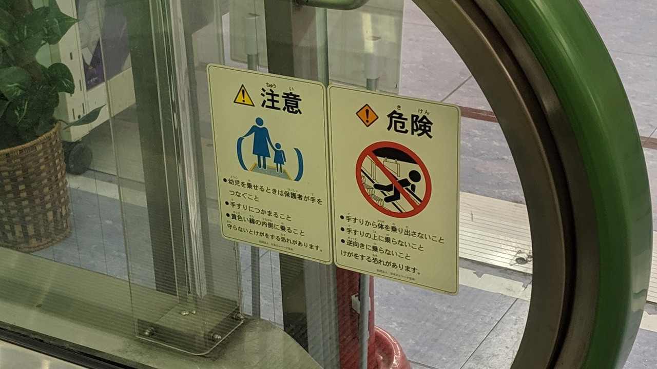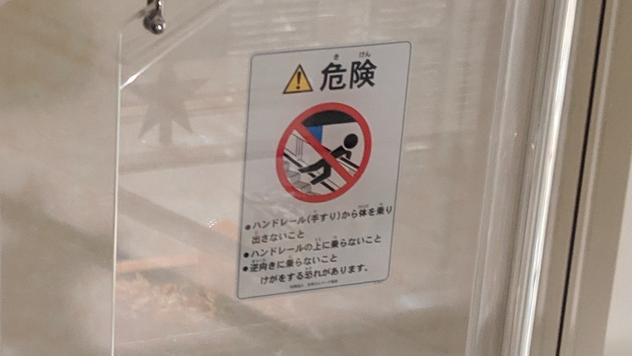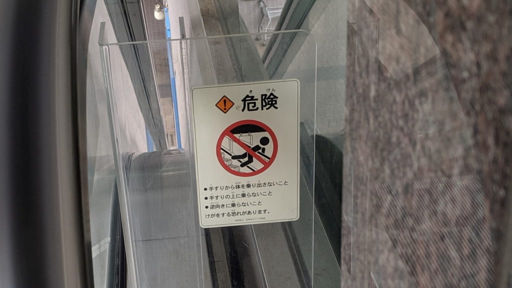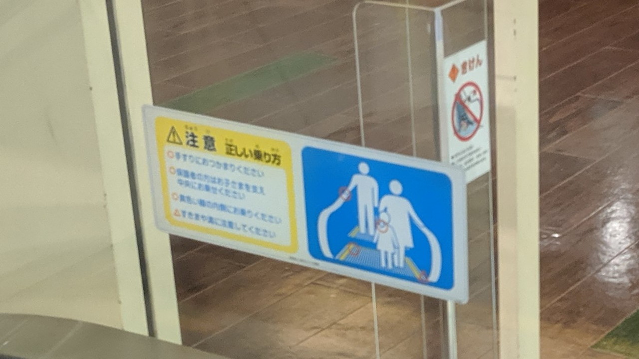 エレベーターは今回未確認でしたが、エスカレーターでは横長の2種類と、乗り出し禁止バージョン2の貼付を確認しました。
