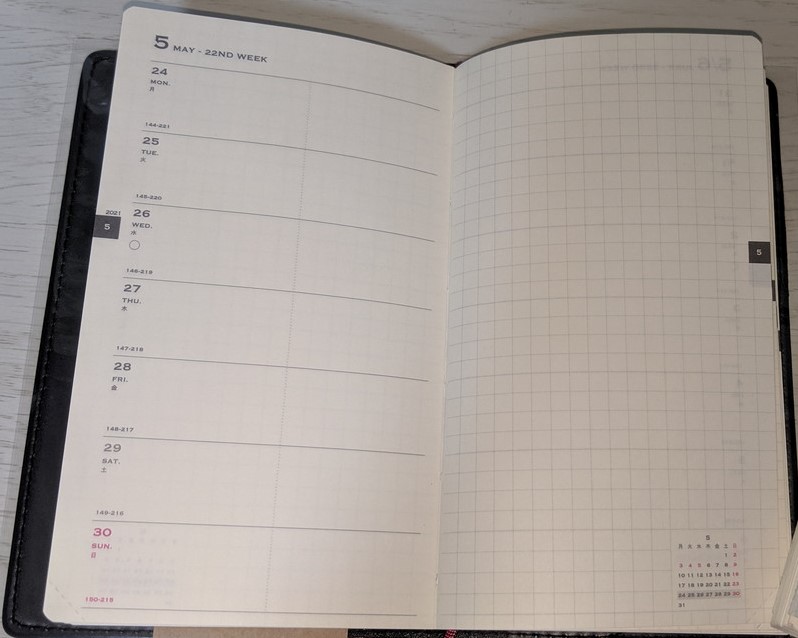 左側には1日1行分の記録スペースがあります。体重や支出はスマホアプリで記録しているので、何を書こうかな。