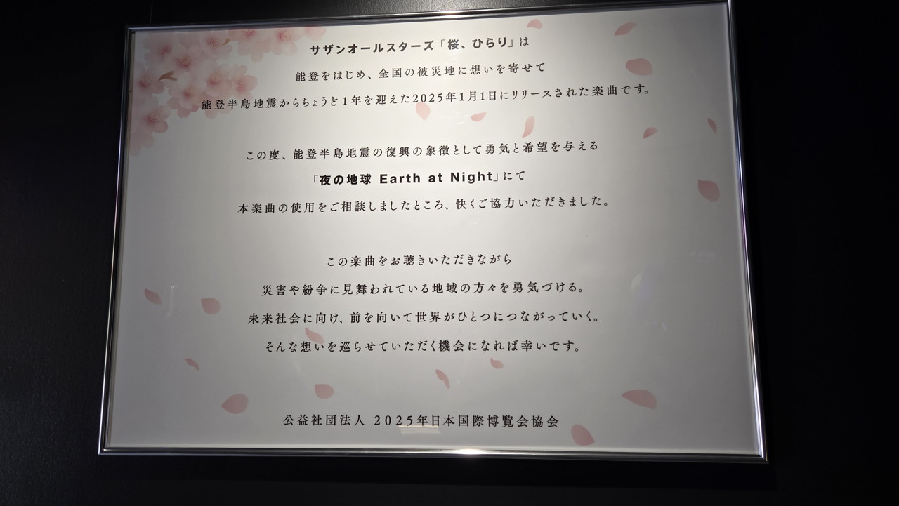 能登半島地震からちょうど1年が経った今年の元旦にリリースされたという「桜、ひらり」。サザンオールスターズの楽曲ということと、その歌詞もパビリオン内の展示で紹介されていました。
