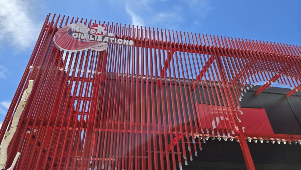 赤く目立つ外観と、展示エリアでは赤い球体(文明の黄金時代に関するオブジェで太陽を示している)がよく目立つパビリオンです。