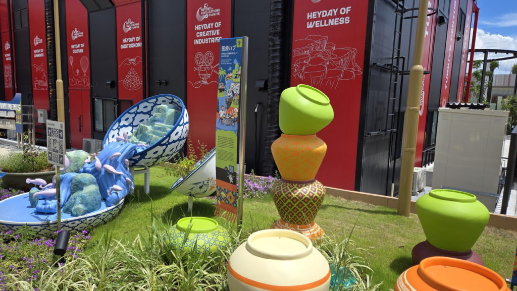 パビリオンの建物の外に展示されているカラフルなオブジェも好印象でした。ブルー、オレンジ、イエローグリーンの色使いが上手だと思います。
