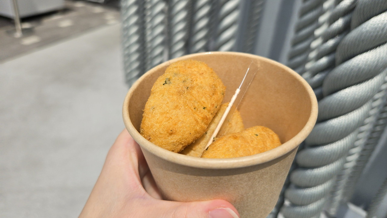 万博での食事代は量に比して高いのですが、わたしが注文したバカリャウコロッケは小さなカップに3個入っているだけで1,100円です……!