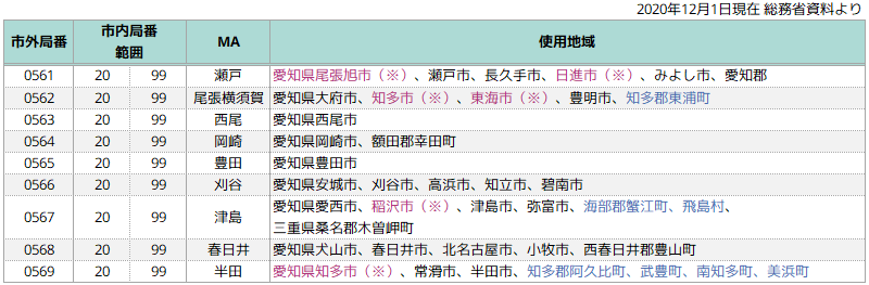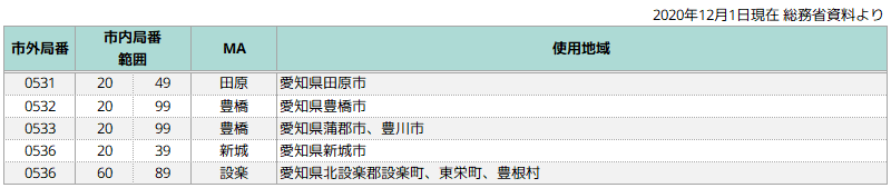 表の場合は単位料金区域(MA;固定電話で市内通話が可能な範囲)の名前が一致していますが、0533のように使用地域の市名とMA名が一致していない地域もあります。