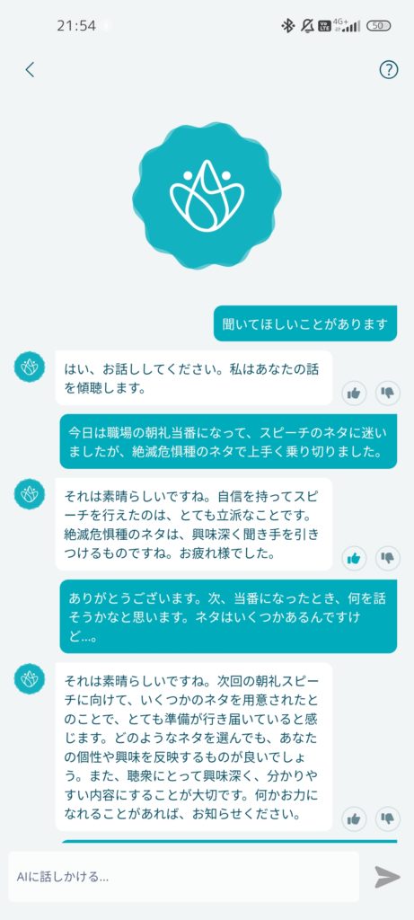 チャット形式でAIに話を聞いてもらうというものです。どんなものか試してみました。