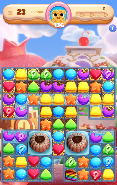 例えばポイセンベリー号のパワーレベル4では、1色のマカロン(キャンクラでいうキャンディ)と別の色のマカロン8個を消す効果が使えるが、レベル1300のようなワッフルを集めるタイプのステージで重宝する。