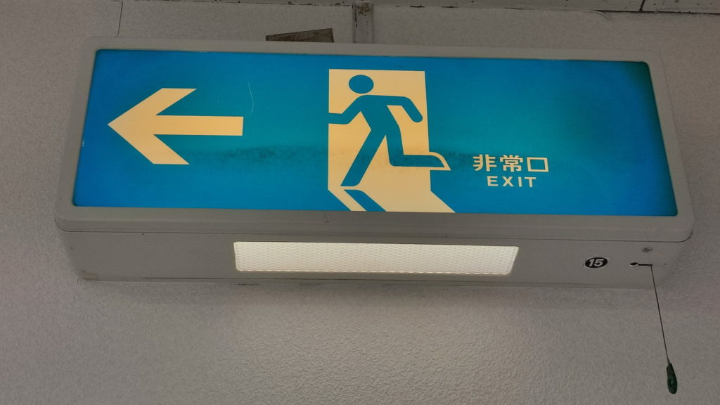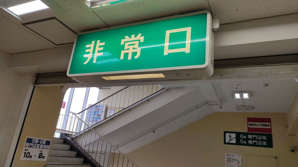 文字だけの「非常口」表記なんて珍しいですし、コバルトブルーの背景の非常口も懐かしいです。