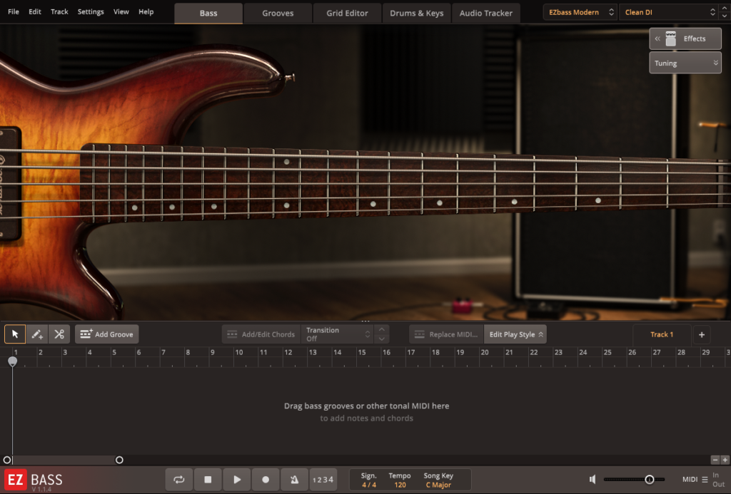 EZBassでは「Grooves」タブから予め登録されたフレーズを適当に選び、コード進行を変えていけばそれだけで楽曲のベースの部分が大体出来上がってくるでしょう。