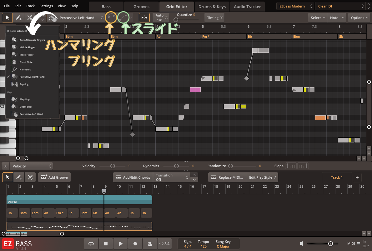 自分はベース音源でもうひとつ「MODO BASS」を所持しているのですが、アーティキュレーションの打ち込みはここまで簡単ではありません。