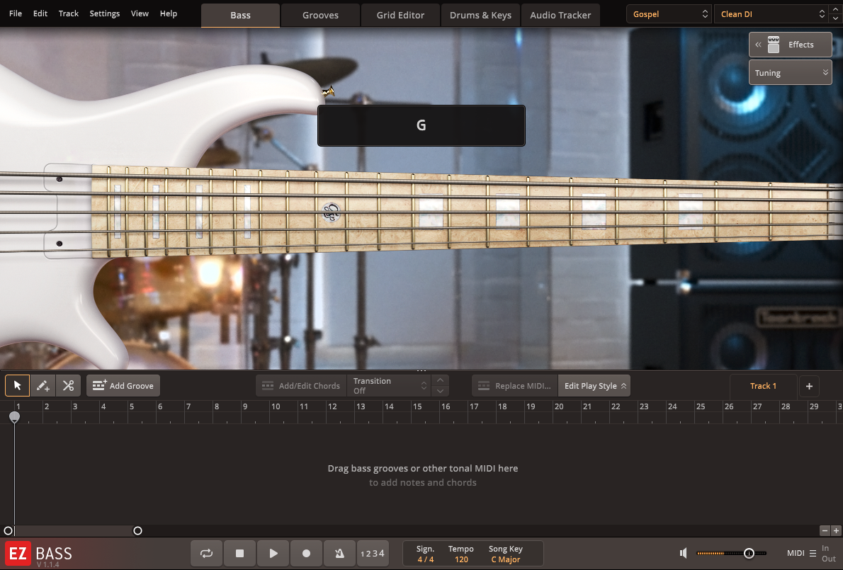 EZBassでは「Grooves」タブから予め登録されたフレーズを適当に選び、コード進行を変えていけばそれだけで楽曲のベースの部分が大体出来上がってくるでしょう。
