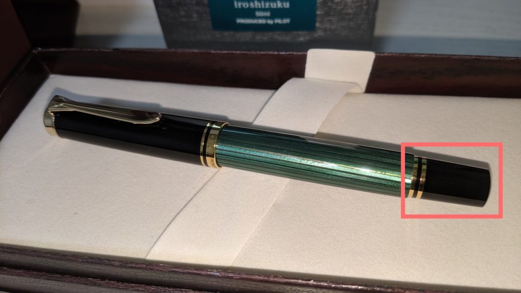 特徴的なのはボディ中央の縦縞でしょう。エメラルドグリーンの緑縞はスーベレーンの紹介写真でもよく出てきますね。自分もこの色を買いました。