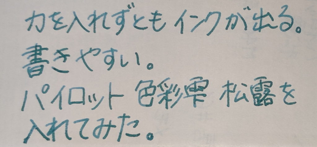 松露は青みがかった深い緑色のインクで、書き始めと時間が経ったときの文字の色が若干変化します。スーベレーンの緑縞の色にピッタリですね。