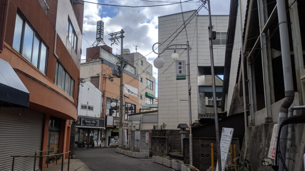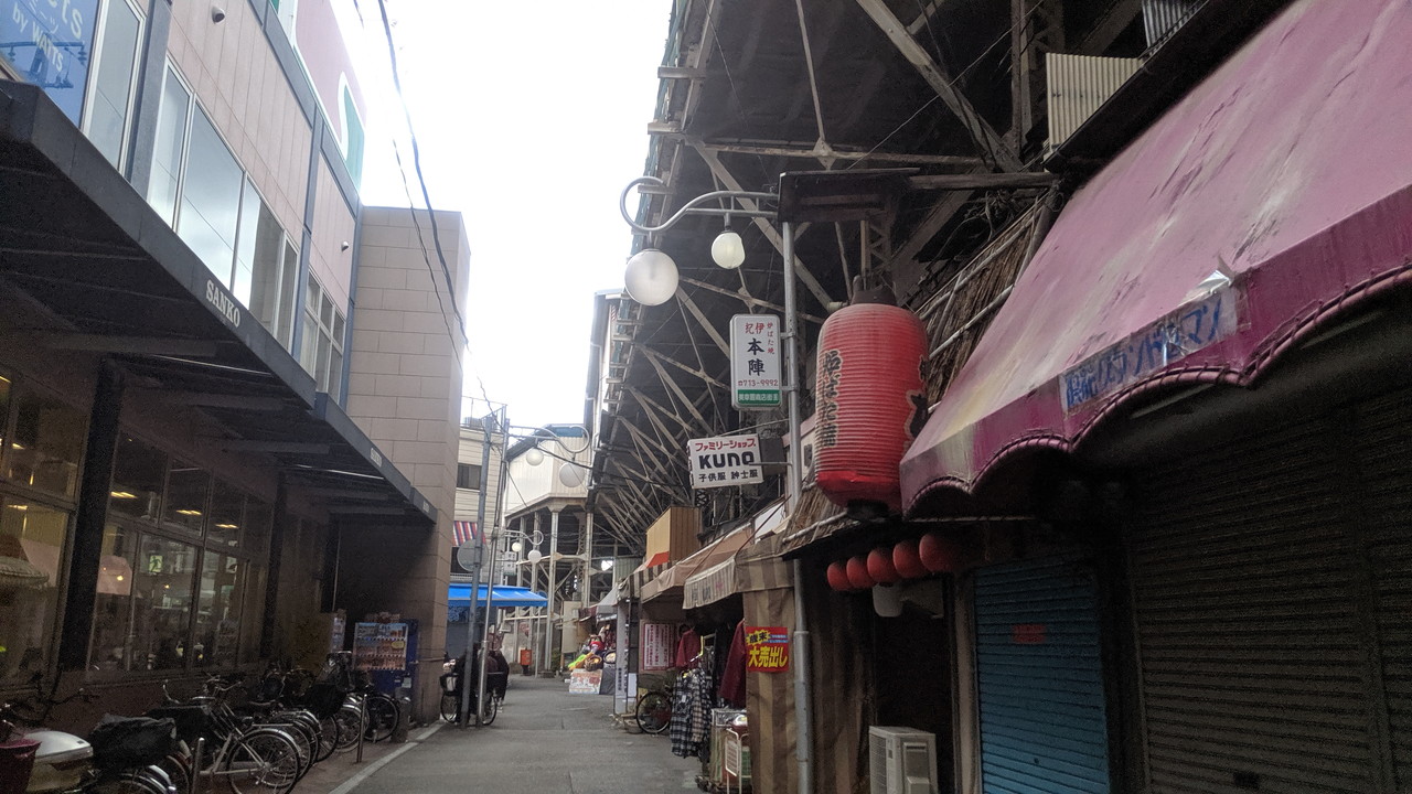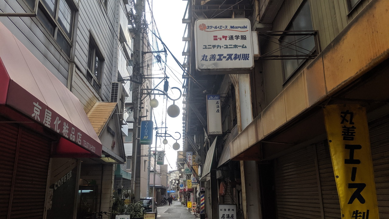 近鉄南大阪線「河堀口駅」で下りて出口を左に曲がると、JRの高架下に商店街の店舗が並ぶ道路があります。