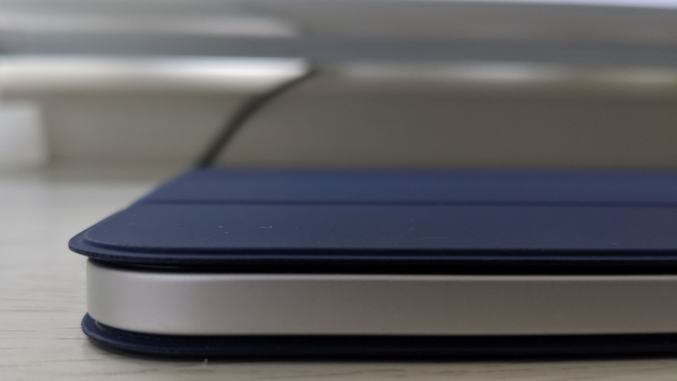 せっかくのiPadのスタイリッシュさを活かすべく選んだカバー。側面から見てもほとんどカバーなしで使っているように感じられます。