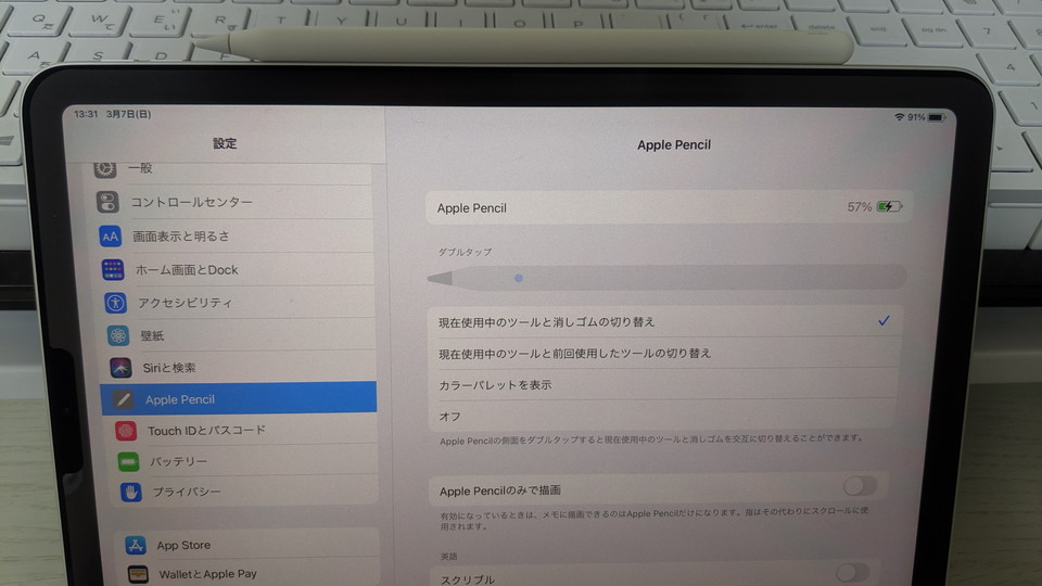 さらに、ノートアプリで手書き入力する際には、ペンの上部を素早く2回タップ(ダブルタップ)することで、ペンツールと消しゴムツールを交互に切り替えられるのです。先ほどの写真で手書き入力したときは大活躍でした。