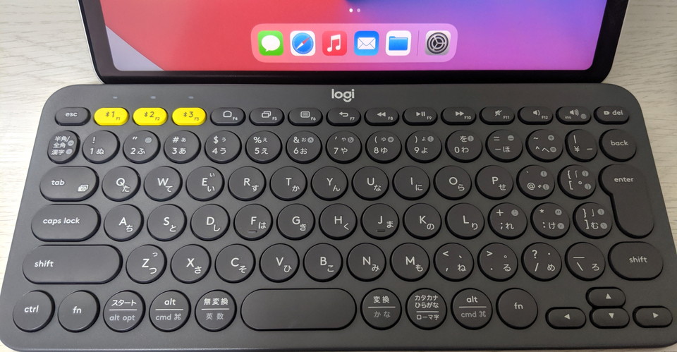 全体的に丸みを帯びたフォルムが可愛らしいです。パソコン、スマホ、タブレットといった端末を最大3台まで同時ペアリング可能とのことで、左上の黄色いキー(本体色によってその部分の色が異なる)を押してペアリング中の端末を切り替えられます。