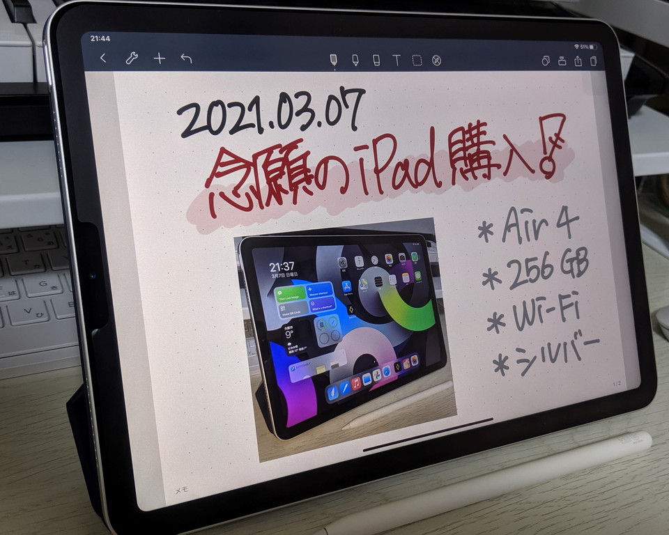 初めてのiPadは「Air 第4世代」で、去年10月にリリースされたAirの最新世代です。画面サイズは10.9インチ、大きさはB5ノートとほぼ同じくらいです。
