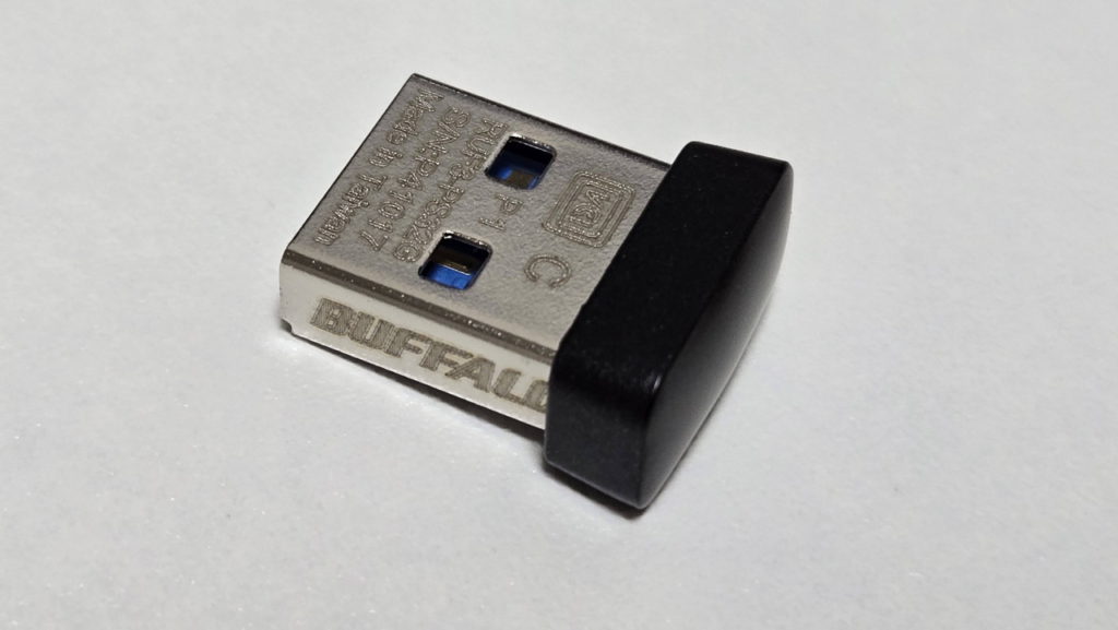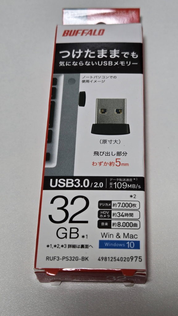 USBメモリーといえば一般的に細長いというイメージですが、今回選んだのは無線レシーバーほどの大きさの超小型の商品。32GBで1,500円弱です。