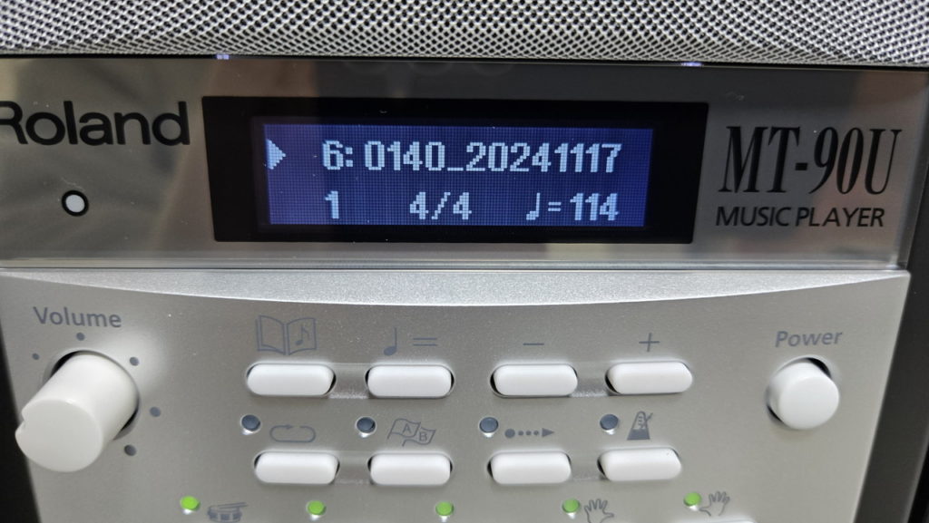 再生画面には上段にフォルダ内の通番と曲名(MIDIファイルの名前)、下段左から演奏中の小節番号、拍子、BPM(テンポ)が表示されます。