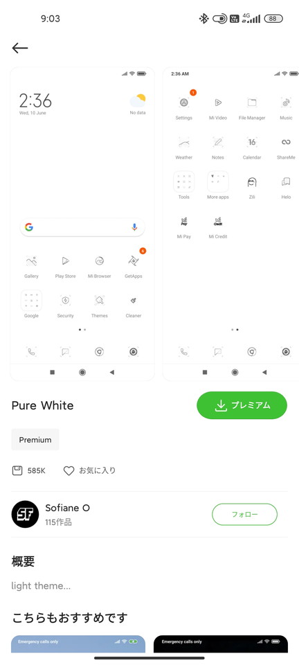 欲しいテーマが見つかったら緑のボタンをタップ(画像右)。そこには「プレミアム」か「無料」のどちらかが表示されます。