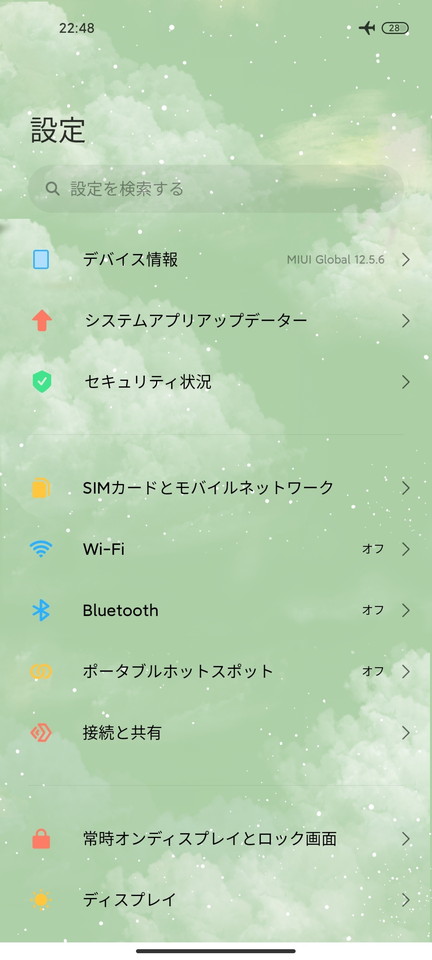 MIUIでは壁紙やアイコンだけでなくシステム領域(ex.設定画面の背景)にも変更が加えられ、テーマによってはそれに合わせて作られた時計のウィジェットもあります。