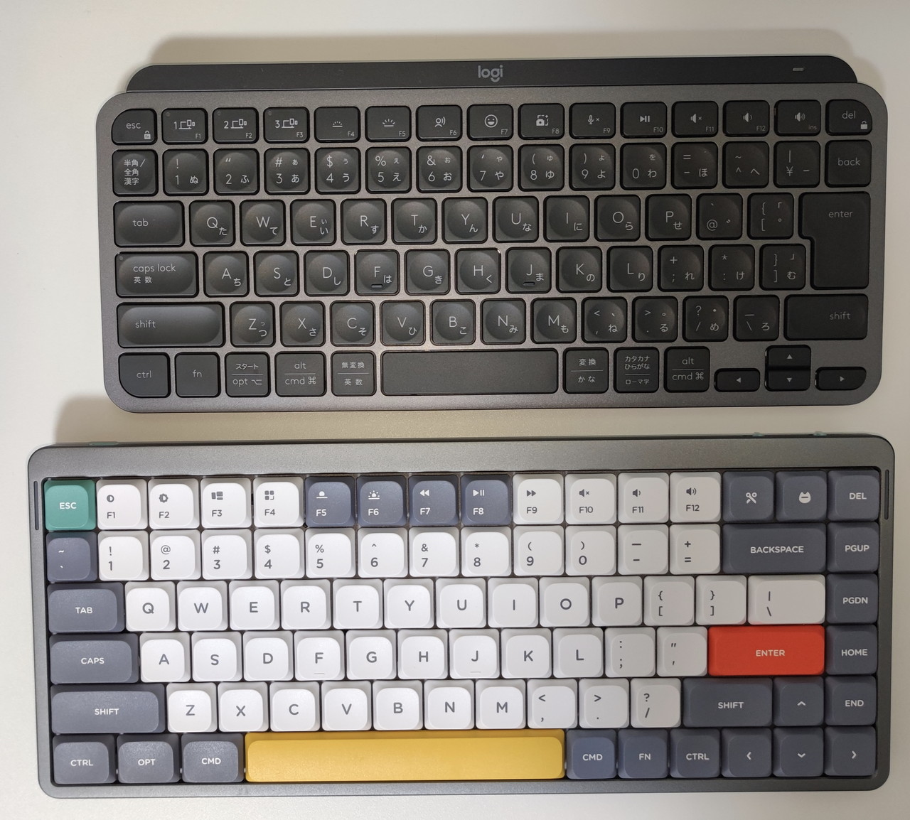MX Keysはフルサイズ(テンキー付き)と今回購入したMiniサイズの2種類がラインナップされていますが、前者は通常のフルサイズキーボードと同程度の幅43cm、後者はフルサイズにおけるエンターキーの列より右側の部分を抜いたサイズ感の幅30cm弱。