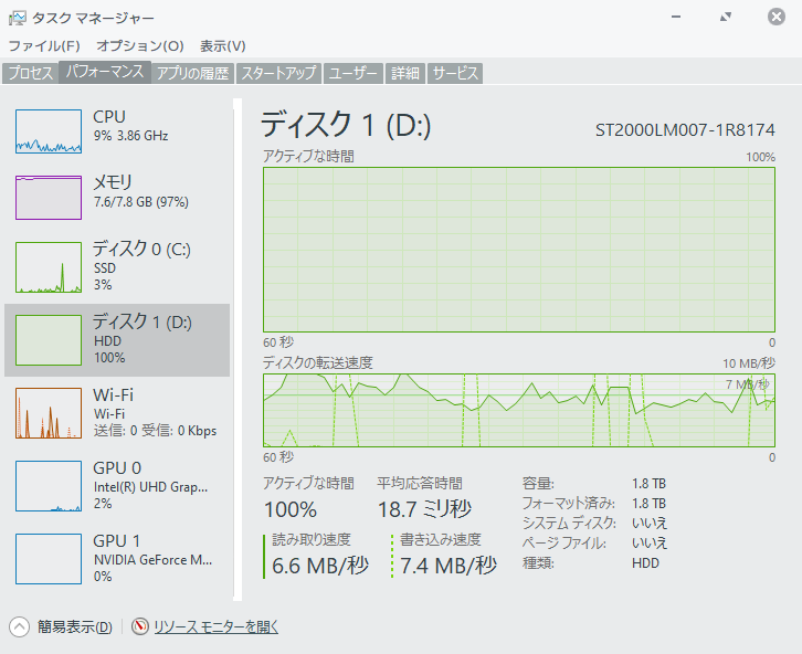 CPUはCore i7なのでそこまで問題ではありませんが、メモリとHDD使用率が常時80%以上になっていて、特にHDDは100%近くに張り付いている状態となっていました。
