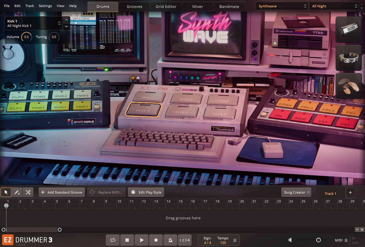 EZDのプラグインでSynthwaveをロードさせたときのスクショには、レトロなコンピューターやドラムマシンのイラストが精巧に描かれています。実際に手にしているわけではないのにその実物を操作しているような気分になり、やる気が上がりますね。