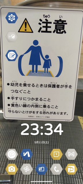 趣味が出ていますが、好きなステッカーの写真を壁紙にしています。エスカレーターの乗り方を説明したもので丸型の次に古いバージョン(四角型V1)。個人的にはエレ協のステッカーの中では一番のお気に入りです。写真は2018年7月、あべのルシアスB1Fのエスカレーターにて撮影。