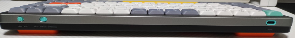 左から順番に、WindowsとMacの切り替えスイッチ、電源入切や接続方式の切り替えスイッチ、右端にUSB-Cポートがあります。