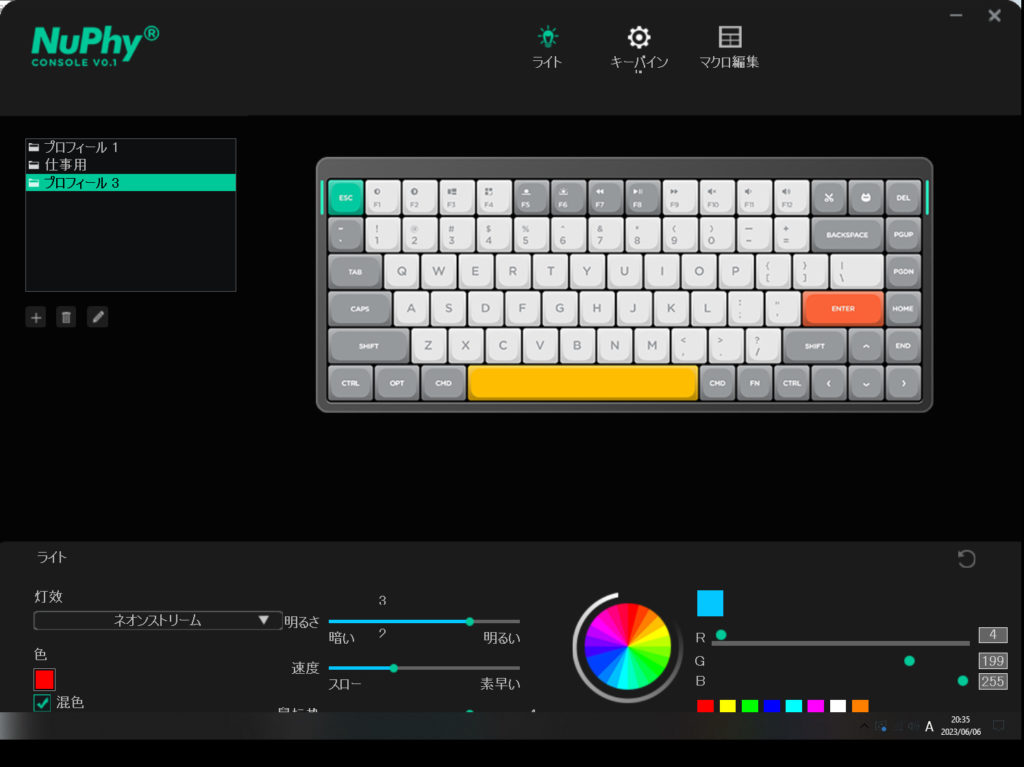 Windowsのみの対応ですが「NuPhy Console」というソフトを使って、ライティングのパターンや色を変更できます。