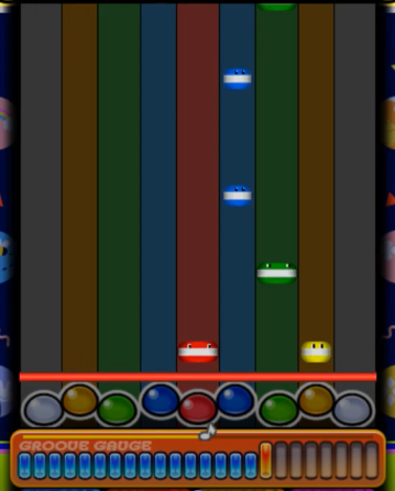 上から流れてくる丸いオブジェクト(ポップ君と呼ばれる)が赤いラインに重なるタイミングで、オブジェクトの色と対応するボタンを押すことでスコアを取り、ゲームをクリアしていきます。