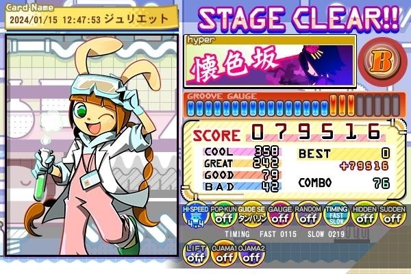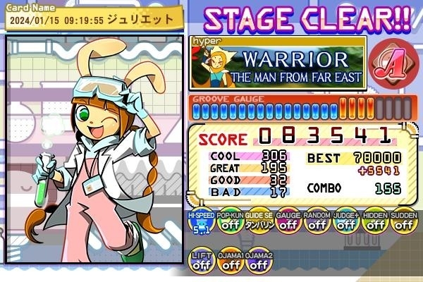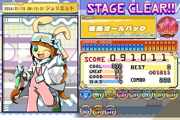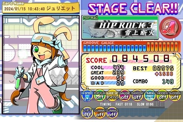 自分はクリアまでに5回ほどかかり、ヒップロック系のNORMAL譜面の中では唯一2024年に入ってからクリアメダルがつきました。