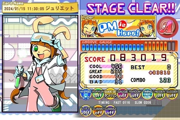 実は年末にもACのポップンで遊んだのですが、そのときはプレイ終了時点で75.68。今回の4時間分で1.5ポイント上昇し、77.18になりました。