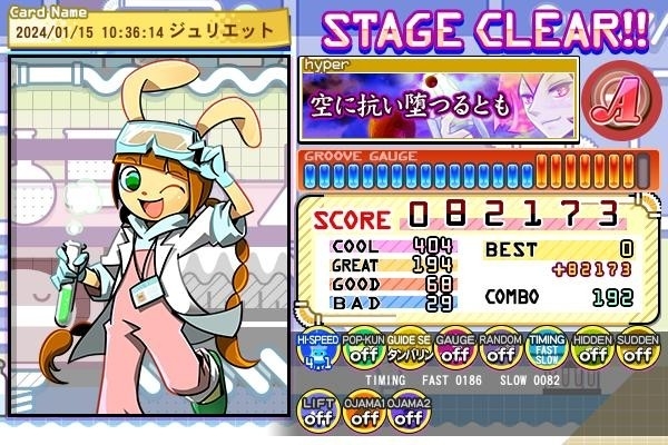 最近ハマっている曲で、お気に入りでもあります。LivelyでHYPER譜面を銅◆にメダル更新したときから曲が好きになり、ACでも同譜面にクリアメダルをつけたいと思うようになりました。