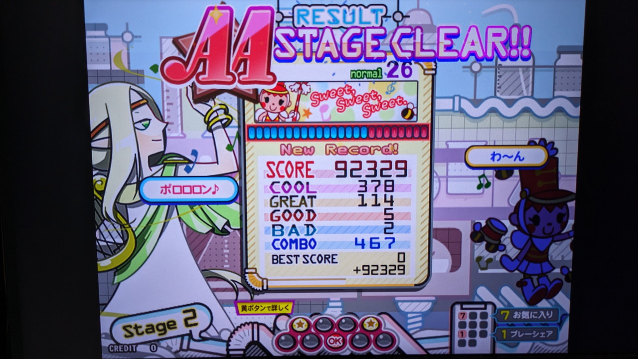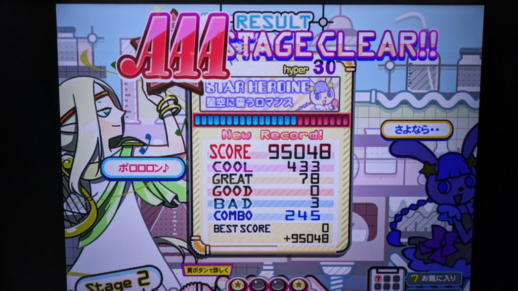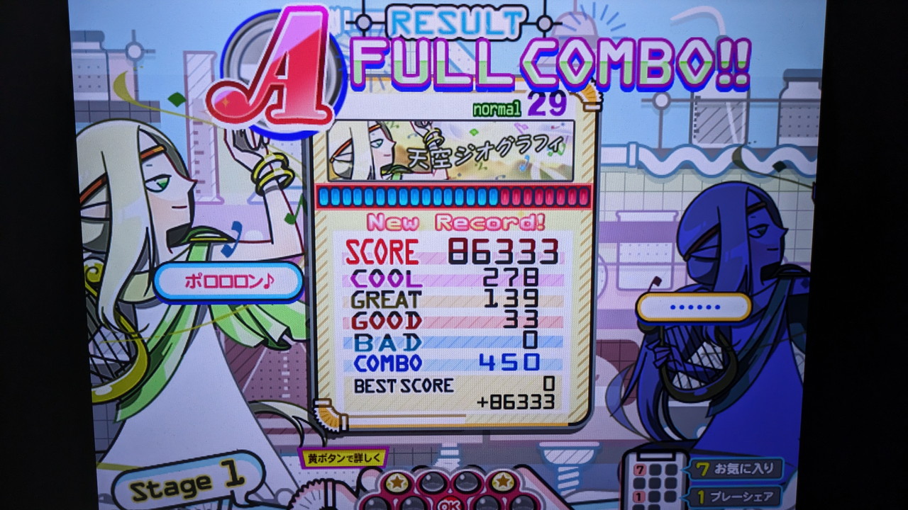 途中、16分音符刻みの青ボタン2連打が何度か出て、そこだけを見ればレベル29としてはちょっときついのではないかと思いましたが、他はリズム難に耐えられれば難易度相応なのでしょうか。