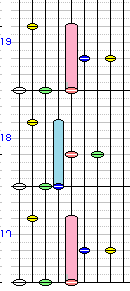 例えば17小節では赤のロングポップを押しながら右青+右黄の同時押しをする譜面となっています。赤ロングポップと同時に押す左白+左緑で左手を使うため、ロングポップは右手で押す必要があるでしょう。