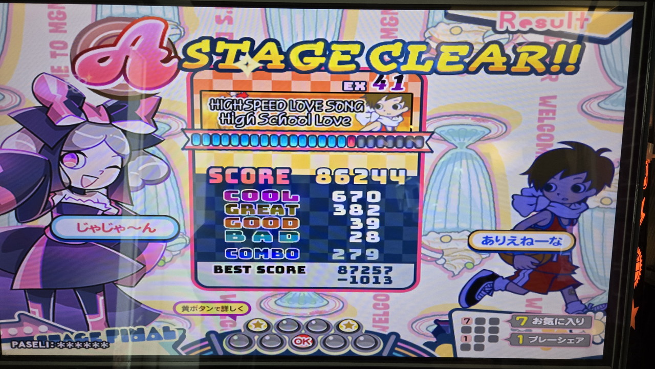 AC筐体でプレイしたレベル40の譜面では2曲目となるBAD一桁のリザルトですが、ロングポップのクロス配置でのミスがなければ、BAD5以下の銅★メダルが狙えそうな勢いでしょう。