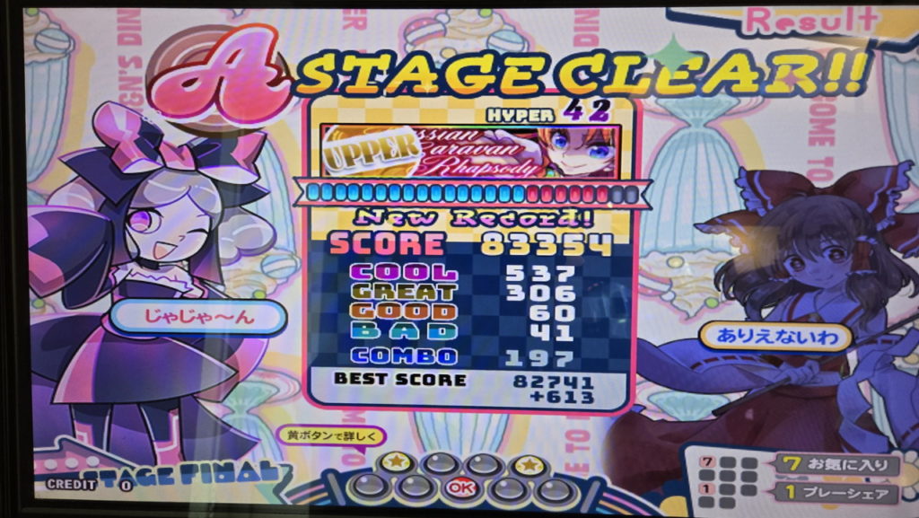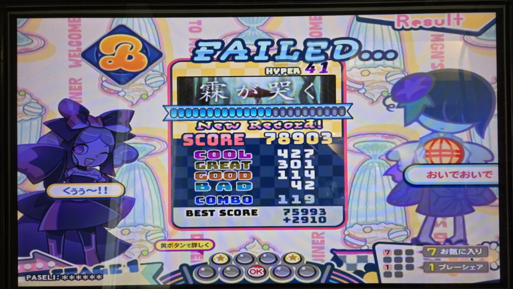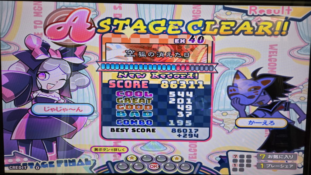 今回はボーダーギリギリでのクリアでしたが、BAD41です。FAILEDしていた頃よりわずかに減っていますが、小階段にできるだけついていってGOOD判定でも繋いだからでしょうか。