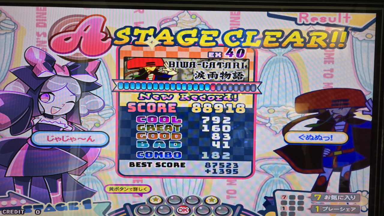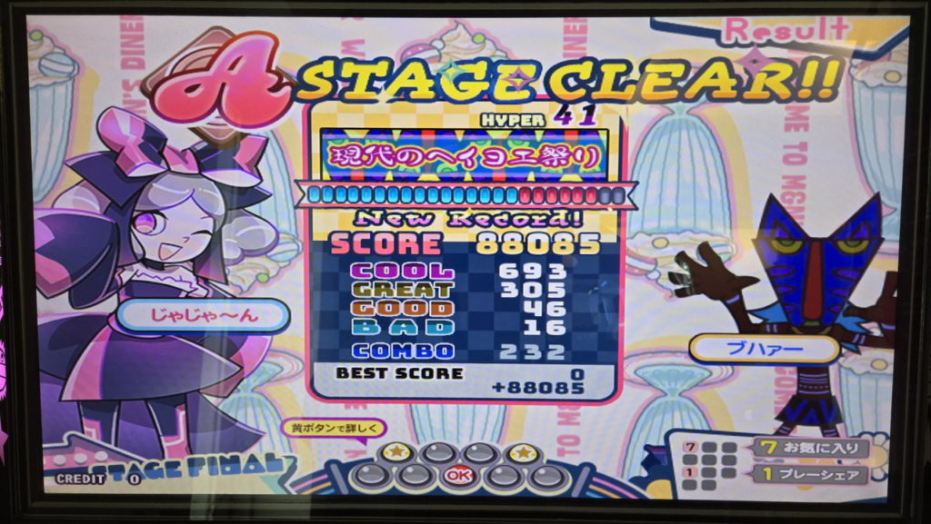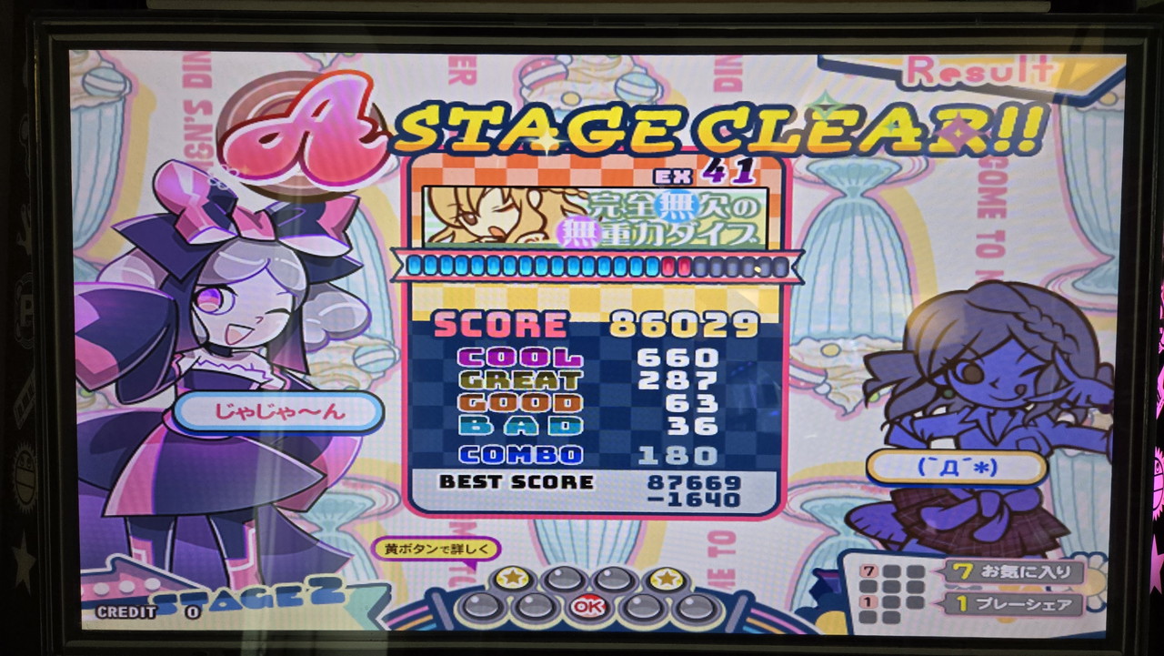 微辛でBAD10台はLivelyで何曲か出したことがありますが、AC筐体では初めてです。スコアもレベル41としては比較的良いほうで、ゲージ残量もきょうクリアした微辛譜面の中では最も多く残りました。