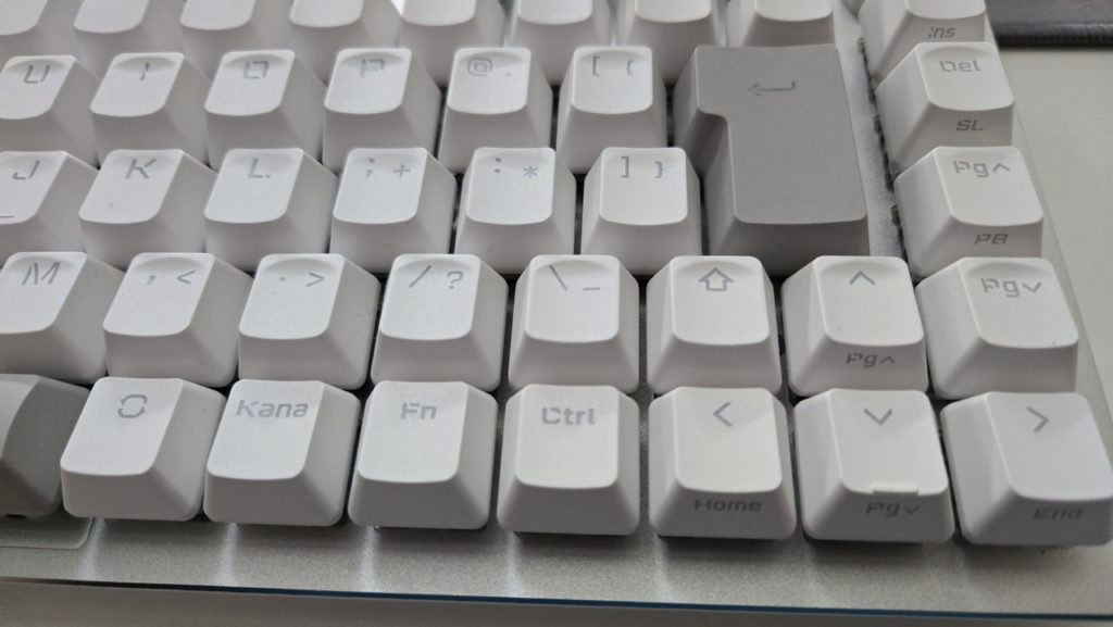 一般的なフルサイズやテンキーレスキーボードの配置とは異なるので、そちらに慣れた身としては結構使いにくいものです。一応、カーソルキーにHome/End等の表記はあるのですが、ブラインドタッチでキーを押しているので余計に…。