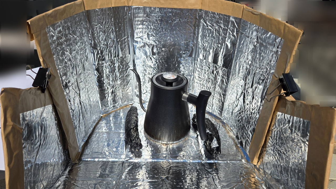 晴天で朝から6時間、ソーラークッカーにお湯の入ったポット、サツマイモを包んだアルミホイルを乗せたソーラークッカーを屋外に放置しました。