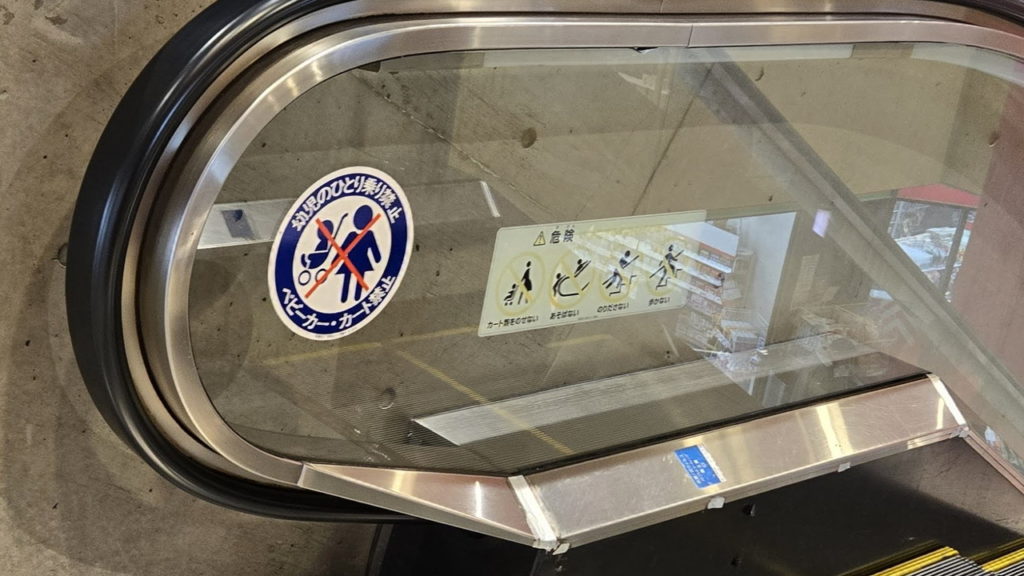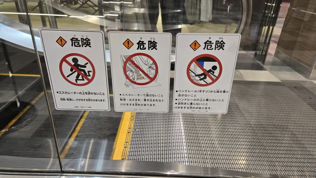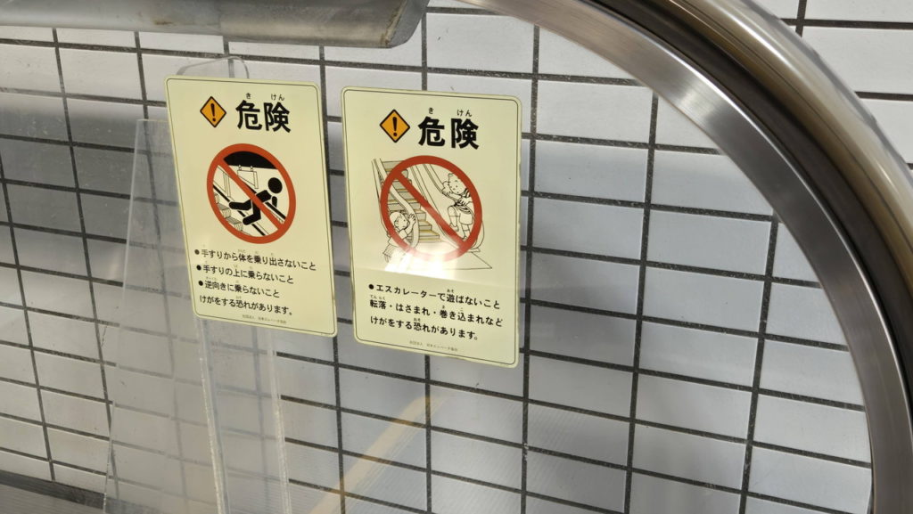 エスカレーターでは、エレ協公式のものが4枚に加え、施設の防災センターによる独自制作の3枚。エレベーターではメーカー(フジテック)独自制作の1種類・2枚が外ドアに貼付されていることが確認できました。