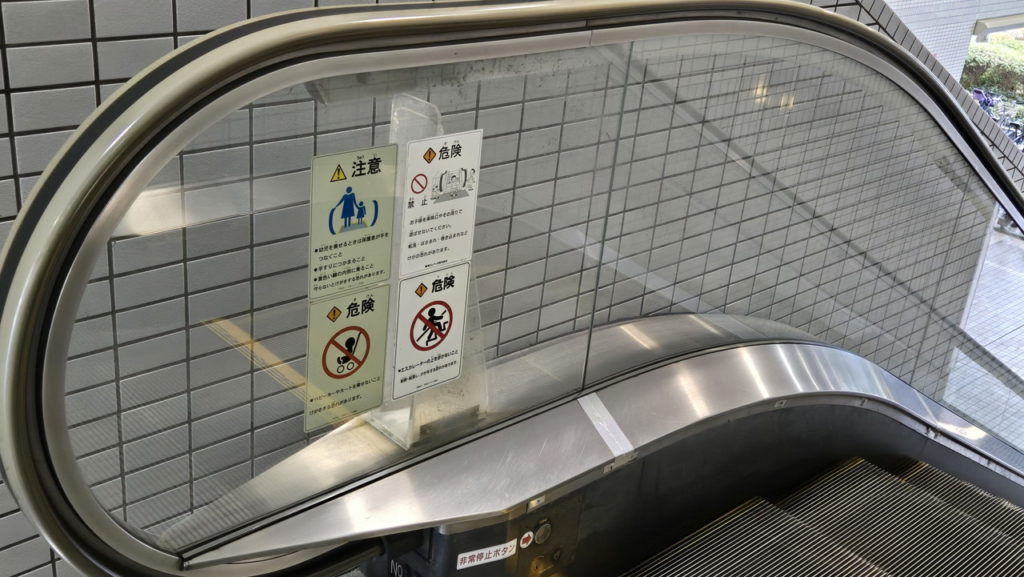 手すり乗り出し禁止 四角型V1のステッカーは2000年代前半より前の建物に設置されているエスカレーターでよく見かけますが、この建物の竣工は2006年とのことです。