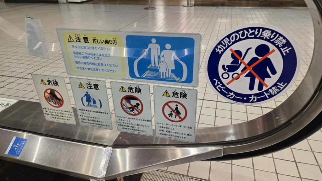 イーストと同じ種類のステッカーが貼付されていますが、乗り方注意、カート類禁止、手すり乗り出し禁止の3種類はすべてバージョン違い。四角型V1です。