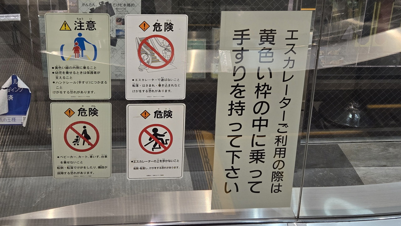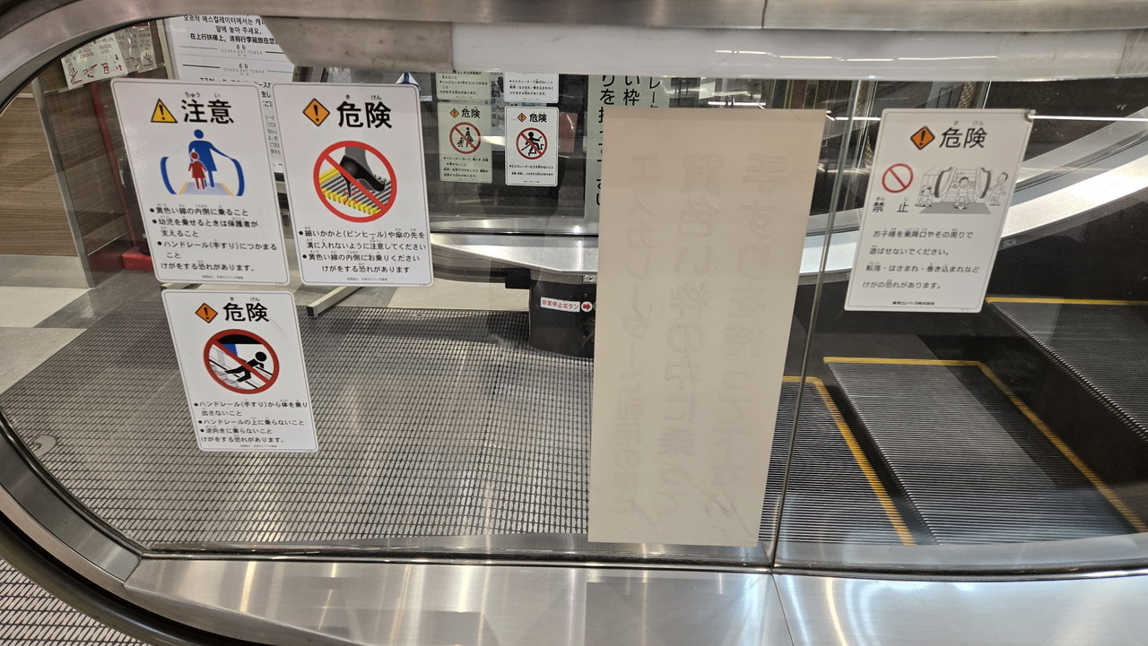エスカレーターでは、エレ協公式のものが4枚に加え、施設の防災センターによる独自制作の3枚。エレベーターではメーカー(フジテック)独自制作の1種類・2枚が外ドアに貼付されていることが確認できました。